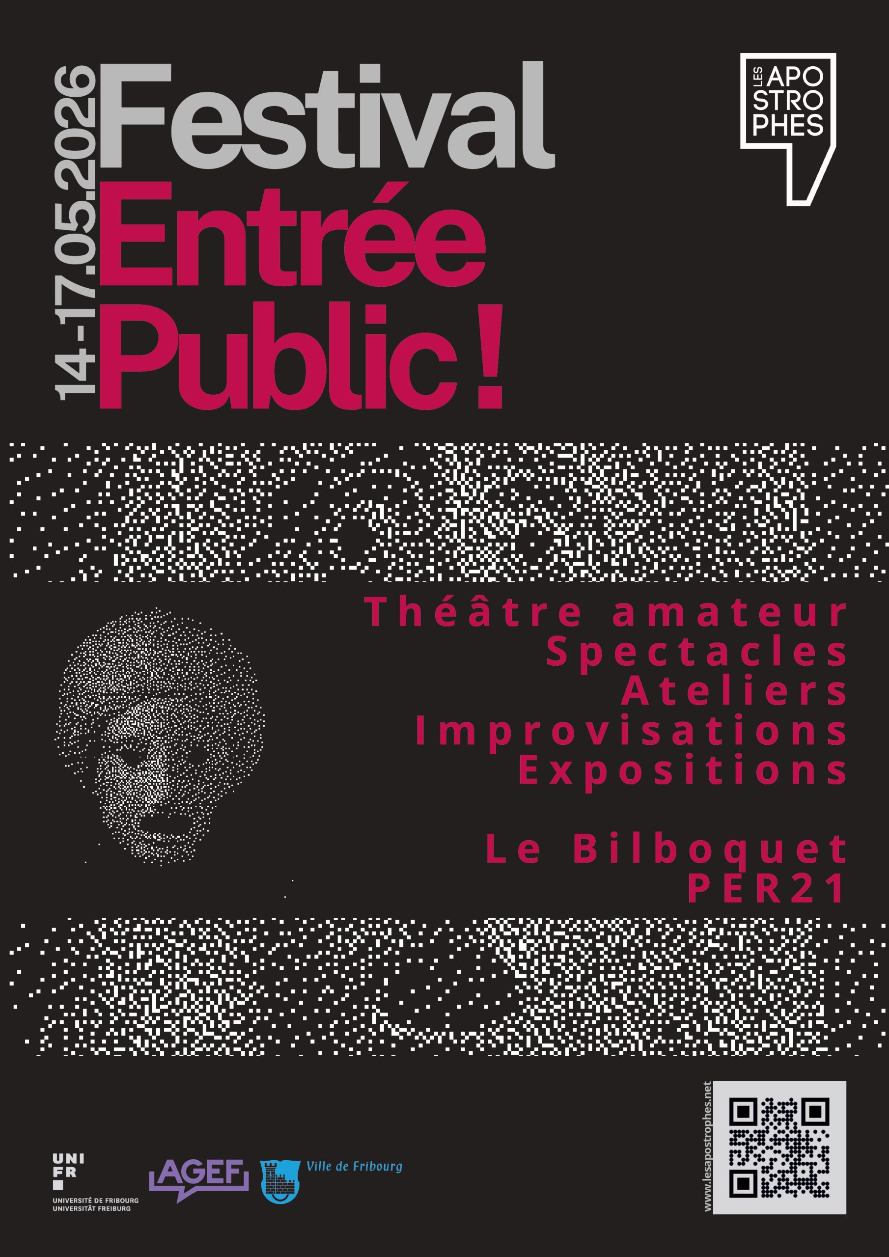 Entrée public ! est un festival de théâtre regroupant des troupes amatrices en Suisse romande et qui leur permet de se produire et de réaliser une expérience enrichissante ! C’est également un évènement pour tous·tes les passionné·es de théâtre, les curieux.ses qui souhaitent découvrir de nouvelles choses mais aussi pour tous·tes celle·ux qui souhaitent faire une chouette sortie !