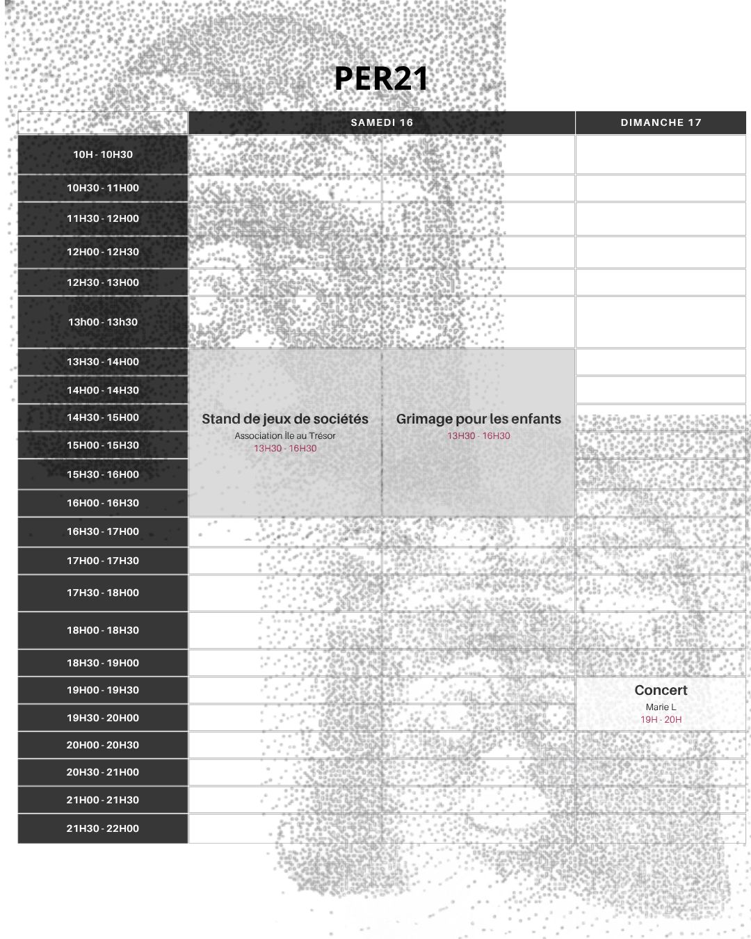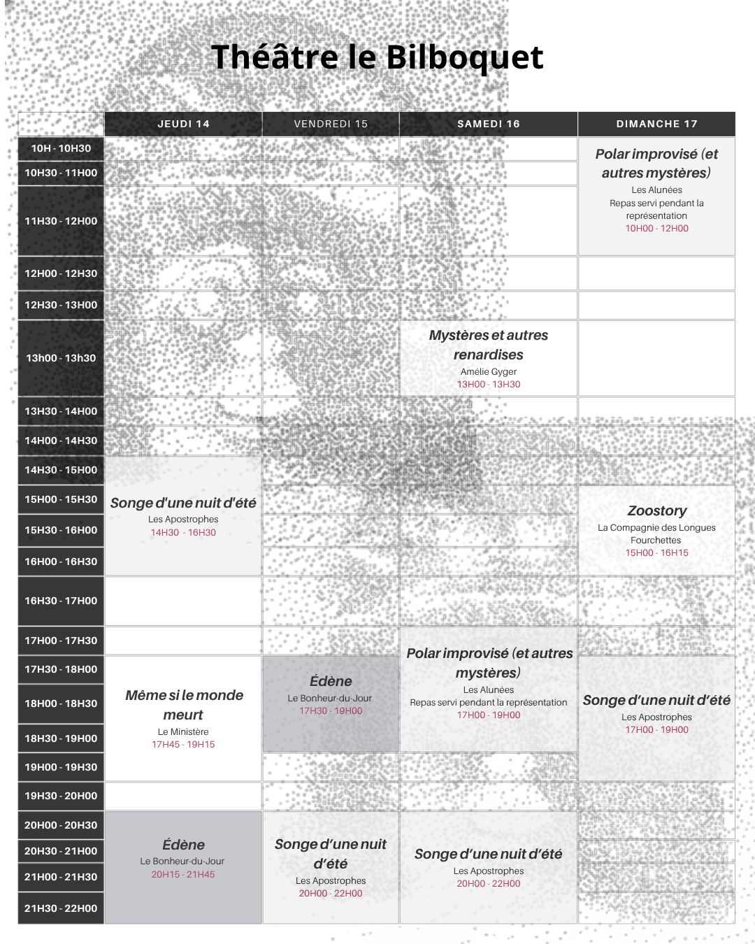 Pour cette édition, l’intégralité des représentation auront lieu au café-théâtre du Bilboquet. En plus des représentations, nous auront le plaisir de vous accueillir pour des activités ainsi qu’un concert dans la cour du site de Pérolles (PER21) le samedi ainsi que le dimanche.